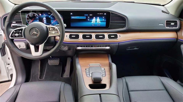 首先看一下它的前脸部分,发动机盖上有四条立体的腰线,使整体看上去比较硬朗,霸气。镀铬双横幅式进气格栅,再加上硕大的奔驰车标,气势非常足,两侧圆润的大灯造型,光源采用的是LED光源,有出色的照明效果。侧面有为上下车提供方便的脚踏板,底部则配备20寸的双五幅轮毂。