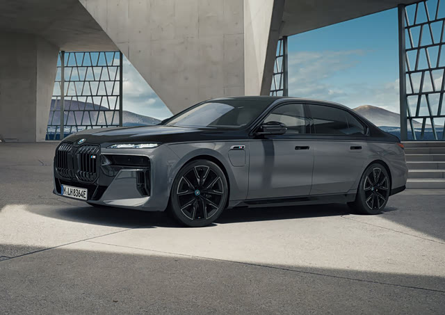 当然与之一同发布的还有宝马新旗舰电动轿车i7,不像是奔驰EQS、奥迪e-tron这样其它品牌有着自己专属的纯电平台,宝马新一代CLAR平台就已然是兼容了燃油和纯电两种设计,这在iX3、i4、i3上就可窥一二,所以i7跟新7系高度相似也就不奇怪了。不同于EQS在设计之初考虑到整车风阻系数的降低,所以才铸就了它如此流线式的造型,i7反而更强调整车气场,只不过在一些前后包围、轮毂盖的设计上来降低风阻,再加上些许蓝色的装饰,让其看起来更符合自身身份而已。