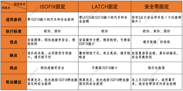 安装便利性:ISOFIX > LATCH> 安全带固定;