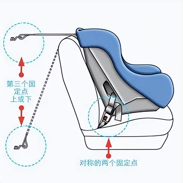 在安全座椅的欧标和国标中都规定,ISOFIX安装必须有三个点固定,其中两个是ISOFIX的接口,另一个是用前支撑腿或者用上拉带。