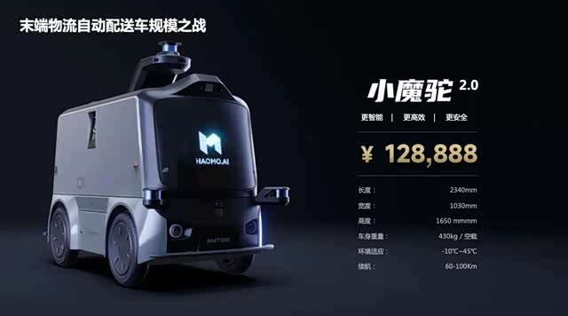 4月19日的 HAOMO AI DAY 上,毫末智行发布了其新一代末端物流自动配送车 “小魔驼2.0”,单车售价128888元,预计5月陆续投放市场。这将是中国第一款10万元级末端物流自动配送车,为末端物流无人配送快速规模化提供了可能性。