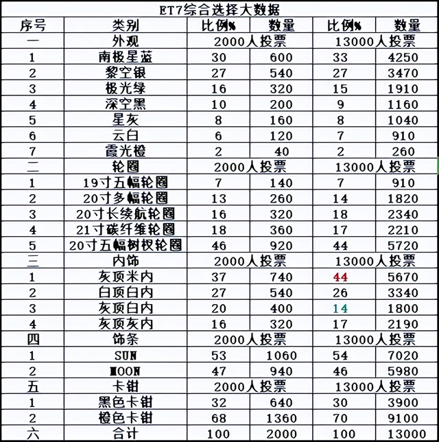 话不多说,直接放出本次投票2000人和13000人时的数据表,虽然这不是最终锁单的配置,但也能代表了蛮多人的想法: