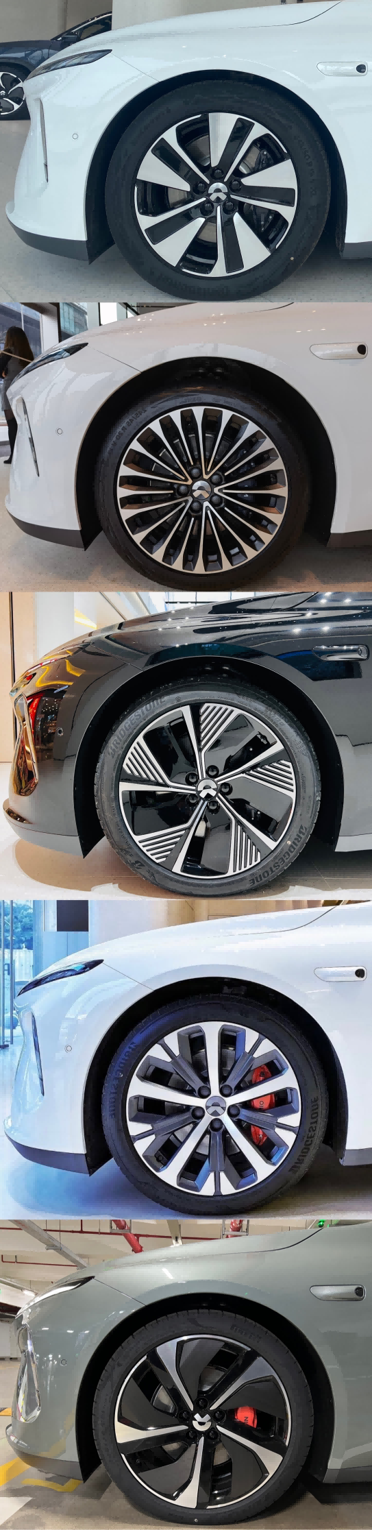 5种规格轮圈/轮胎:19寸五辐轮圈配马牌EC6轮胎、20寸多幅星银轮圈配马牌EC6轮胎、20寸五辐长续航轮圈配普利司通T005低滚阻轮胎、20寸五辐䦀动轮圈配普利司通T005全能轮胎、21寸碳纤维轮圈配倍耐力自修补轮胎