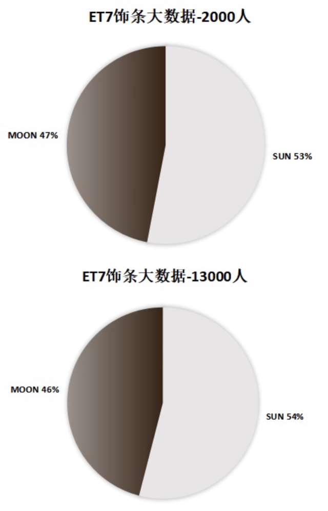 SUN和MOON的选择接近一半一半,SUN的豪华镀铬感,MOON的磨砂灰色细腻质感,两种风格的确难舍难分,就看个人选择了,我猜测SUN的比例会更高,毕竟传统豪华镀铬并且百搭,可能更匹配ET7的定位!如果喜欢运动也可以改亮黑贴膜!