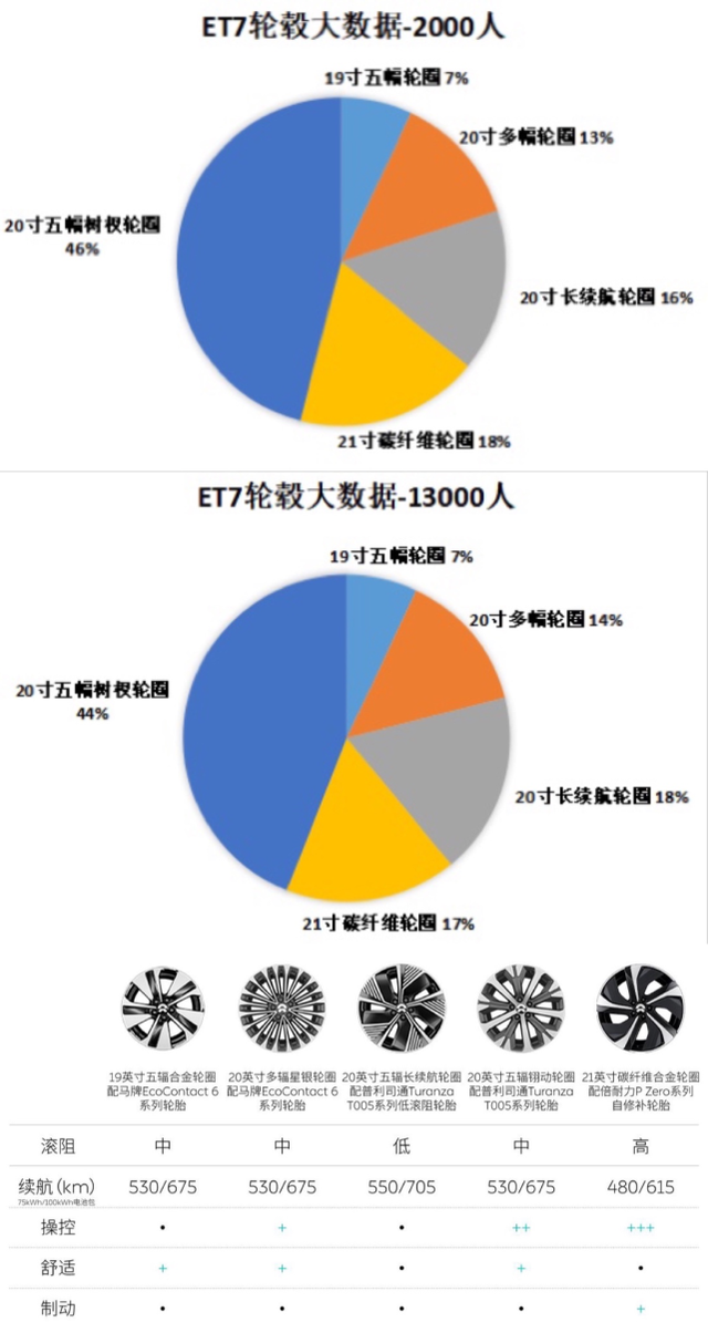 从选择比例也不难推测,ET7首发版选择的比例真的超级高,有可能达到了61%,长续航轮毂(轮胎)的续航和多幅轮毂的豪华感也吸引了不少人选择,甚至放弃了首发送的五幅树杈,根据车友反馈,长续航市区能耗真的惊喜,但是噪音较大,多幅的马牌舒适静音也是一个卖点。
