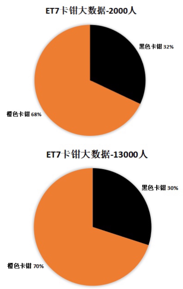 还有就是橙色卡钳和免费的黑色卡钳(前黑后银),这点有点出乎我的意料,橙色选择的很多(70%),其实我觉得原装黑色卡钳质感要比橙色要好,而且后期也方便在外面改色从而匹配不同颜色的车身,毕竟现在原厂的橙色卡钳并不能匹配所有车,这个也同样见仁见智,不过不选橙色卡钳的后卡钳是银色,的确不怎么好看!对了,长续航轮毂不要选橙色卡钳,因为根本看不到!还有一个反常识的小知识就是多幅轮圈露出卡钳最多!