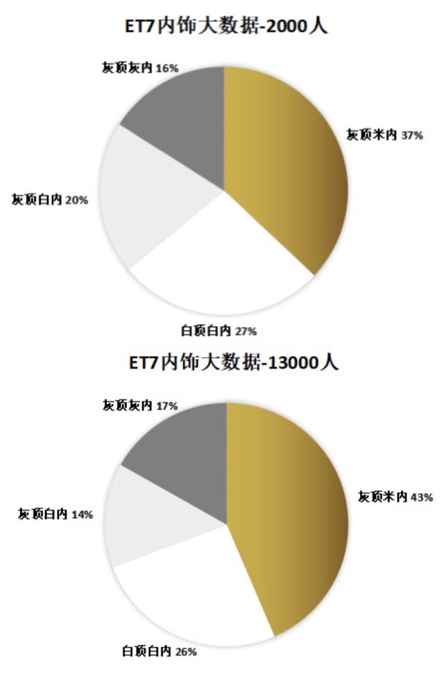 内饰方面2000人和13000人发生了很大的变化,金沙米内饰超过了两种白内饰的综合,彻底占据第一选择,达到了43%,根据量产交付的情况,也的确很漂亮,很温馨,而且金沙米的藤木颜色量产版本也调浅了显得更和谐!