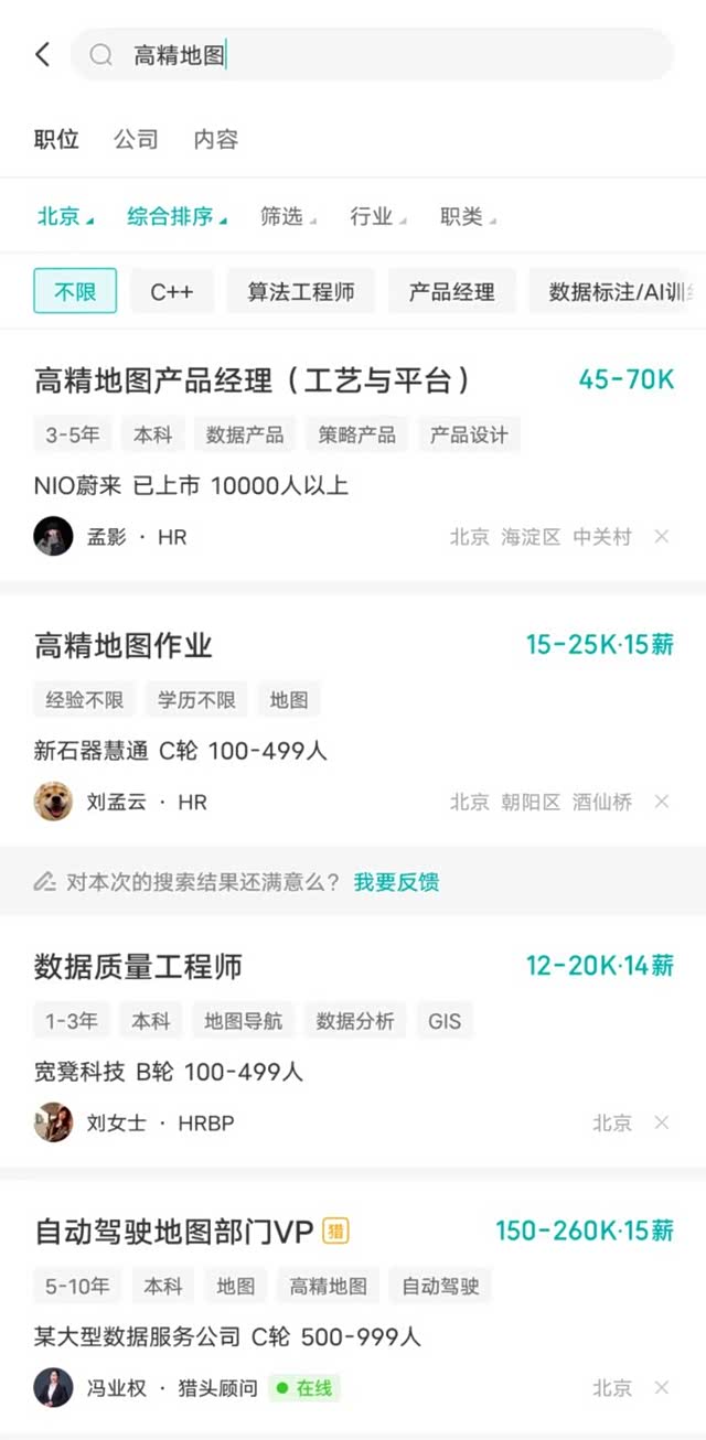 不只是自动驾驶领域,在AI、5G、物联网、车联网、智慧出行等一众热闹的新概念登场时,都离不开高精地图,如果你在招聘网站上搜索“高精地图工程师”,还会发现更有深意的结果: