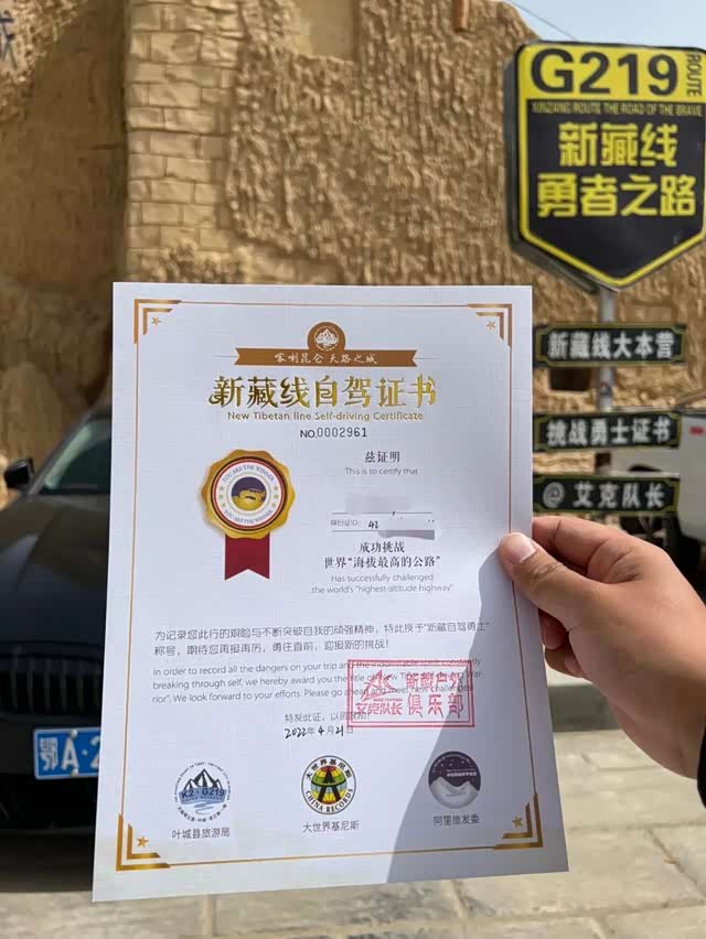 经过两天一夜的奔袭,翻越无数高山,走了无数烂路,我们成功到达新疆喀什叶城县,在这里看到了久违的绿树(西藏因海拔太高,绿叶植物无法生长),还领取到官方认证的“新藏线挑战证书”。