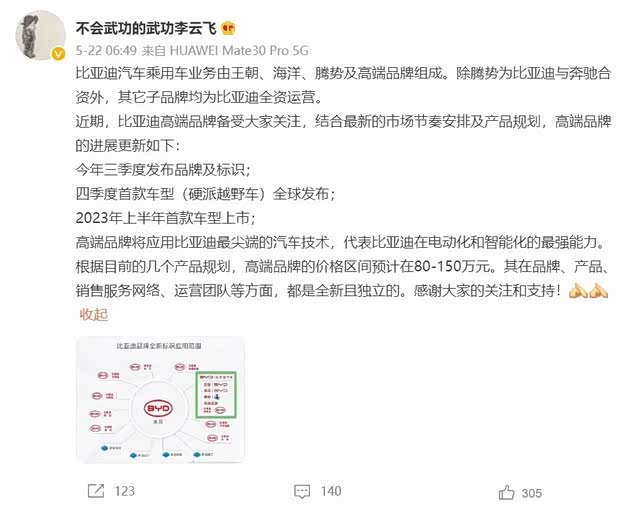 高端品牌将代表比亚迪在电动化和智能化的最强能力,而且价格区间预计在80-150万元。