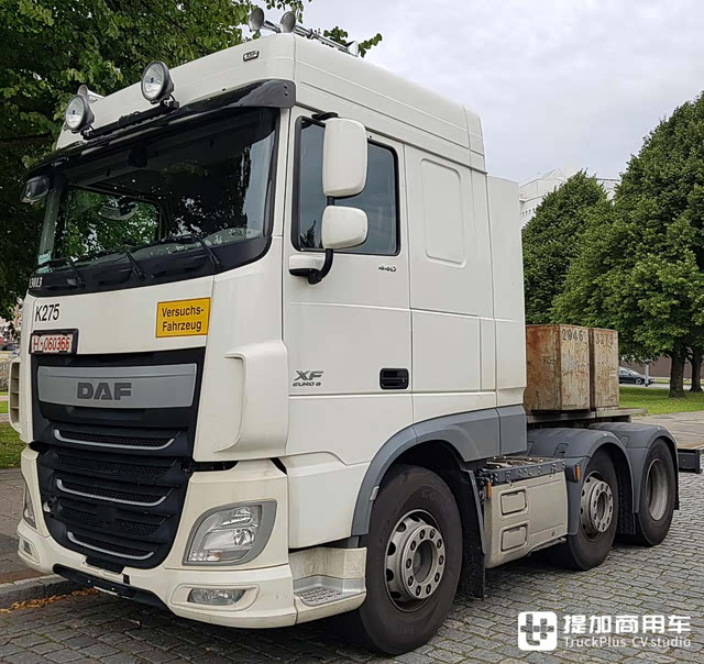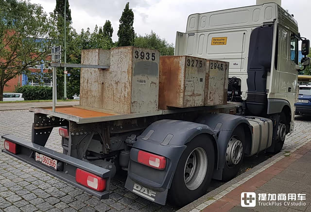 这台特殊的达夫XF就是为了轮胎测试而生的。它基于一台牵引车,但鞍座被拆除,车架上安装了平台,用于安装配重块,用来模拟不同工况下的不同车重对轮胎带来的影响。