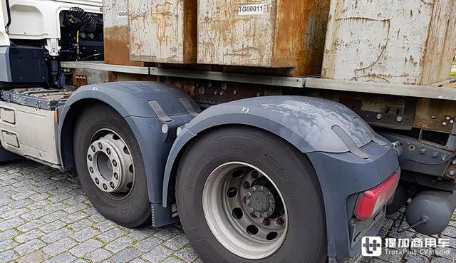 这台达夫XF归固特异所有,此时正在测试Regional RHD2轮胎。在挡泥板上也可以看到此时的轴重标识:第二桥此时承载8吨,第三桥承载7.3吨。比起一般的测试手段,这种测试方式仅需一台车就能覆盖许多种不同的工况情形,综合使用起来的灵活性和效费比算是高多了。