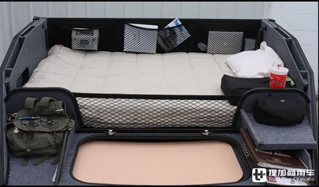 内部结构如图所示,可以看到它带有一张双人床和储物网兜,并带有一部分的储物空间以及中空隔热隔音层。进出位置的口盖放在了朝前的位置,对应皮卡车的第二排。Zoom Room针对不同车型开发了不同的睡眠舱,这样睡眠舱的入口就能直接对接到车顶天窗上,无需额外开孔了。