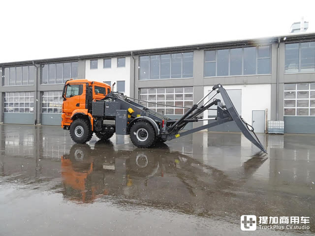 这张图片来源于德国卡车改装企业:Toni Maurer公司的媒体库,引起了笔者浓厚的兴趣。从外观上来看,这是一台新一代曼恩TGS卡车,能从较高的离地间隙以及侧窗线条分辨出来。为什么卡车上安装了一个像挖掘机一样的铲斗呢?是不是有点像耕地的时候用的犁呢?