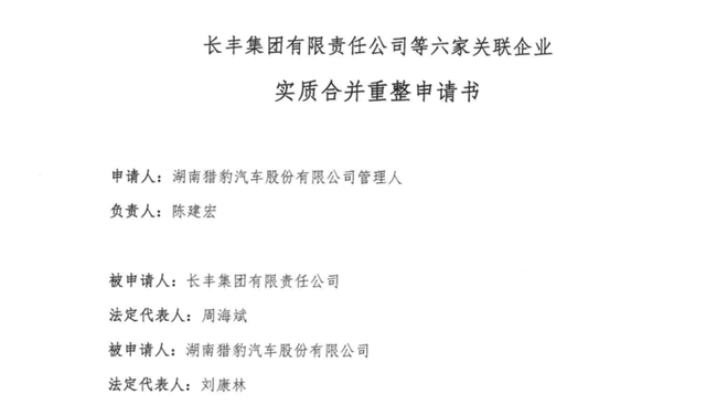 前段时间,湖南省长沙市中级人民法院根据湖南猎豹汽车管理人的申请,裁定对长丰集团有限责任公司(简称长丰集团)、湖南猎豹汽车股份有限公司(即猎豹汽车)、湖南长丰动力有限责任公司、湖南长丰猎豹汽车有限公司、北京长城华冠汽车技术开发有限公司、衡阳风顺车桥有限公司进行实质合并重整。