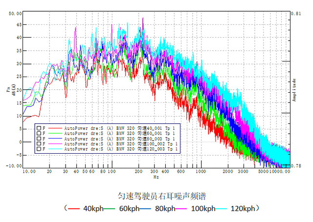 2.对怠速车内噪声频谱进行详细分析,经常引起乘客抱怨的发动机2、4、6、8阶次噪声,BMW 3系的数值均较小,且各工况下无某个阶次异常突出现象。