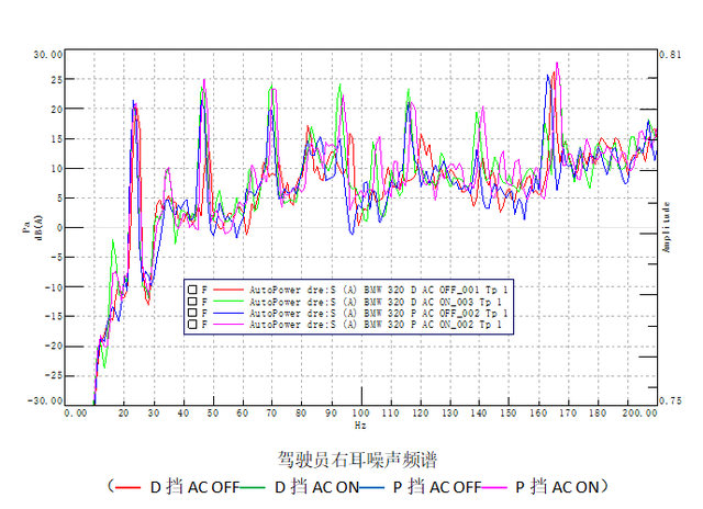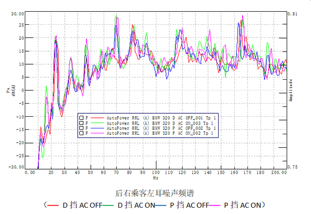 评测根据用户经常使用的怠速工况进行测评,重点关注P挡与D挡时空调开与关的工况。客观测试数据显示,BMW 3系怠速工况整体噪声水平较好。