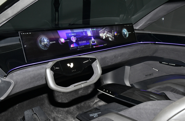 ROBO-01的内饰设计灵感来自宇宙飞船的座舱概念,有2种内饰颜色,宇宙黑和科幻白。座舱中配备了3D无界一体化屏幕,得益于采用高通8295计算平台(高通8155芯片的下一代),集度实现AI算法本地化,满足用户社交娱乐、视频游戏、在线办公等场景化需求。屏幕悬浮式设计在中央仪表板上,两侧集成2个可伸缩的高性能卫星扬声器“RoboSound”,在座舱内提供生动的电影级环绕声效。