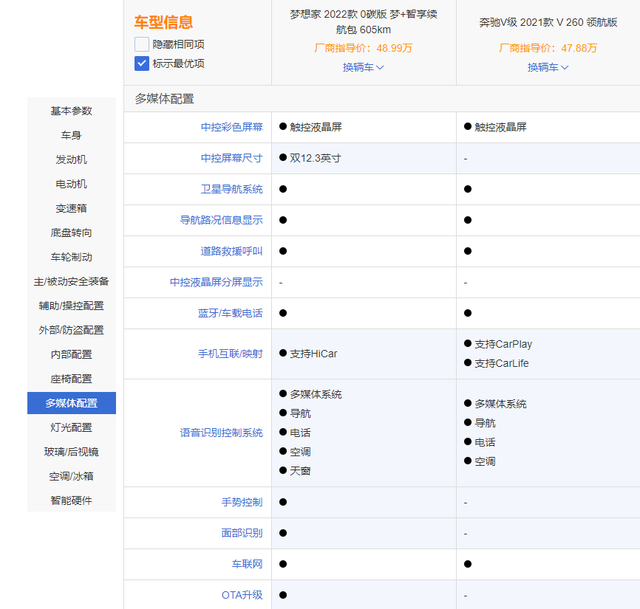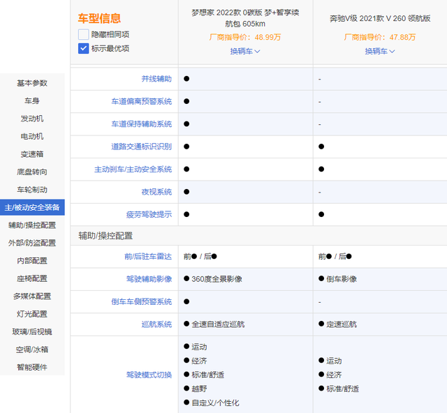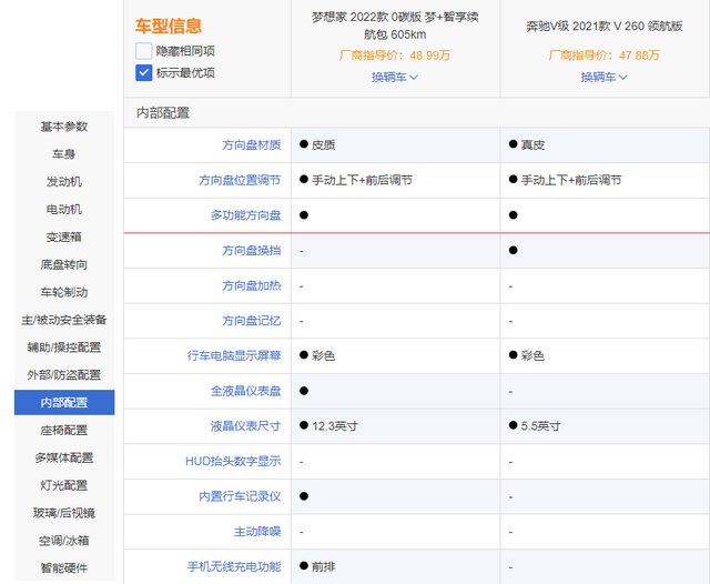 在内部配置方面,我们选取了两车价格差别不大的奔驰V级 2021款 V 260 领航版(指导价:47.88万)和岚图梦想家 2022款 0碳版 梦+智享续航包 605km(指导价:48.99万)进行对比,看看谁更具诚意一些。