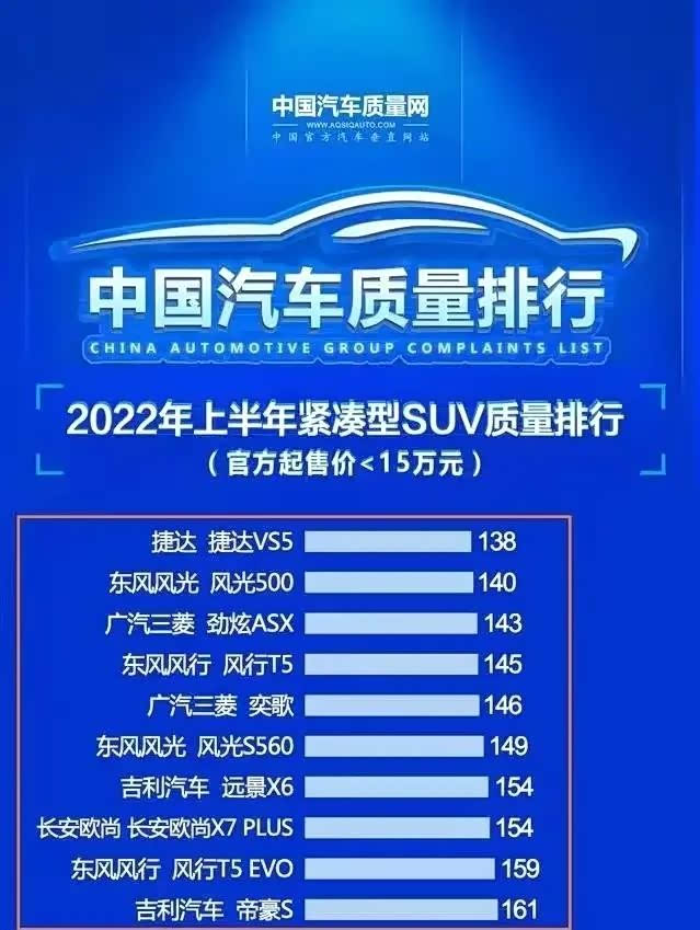 众所周知,紧凑型SUV的市场一直都是关注度最高的细分市场,特别是15万价位以下,购买门槛不高,可选择的款式也多。毕竟15万可以买一个全家出行方便的车型何乐而不为呢,当然,除了定价满足消费者的同事以及优秀的产品力之外,汽车质量可靠性也是各位消费者在买车时所关注的地方。不久前“中国汽车质量网”又发布2022年上半年紧凑型SUV质量排名榜单,里面按顺序的给每一辆参测车型进行打分,接下来就让小编带大家一起看看排在前10的车型有哪些。