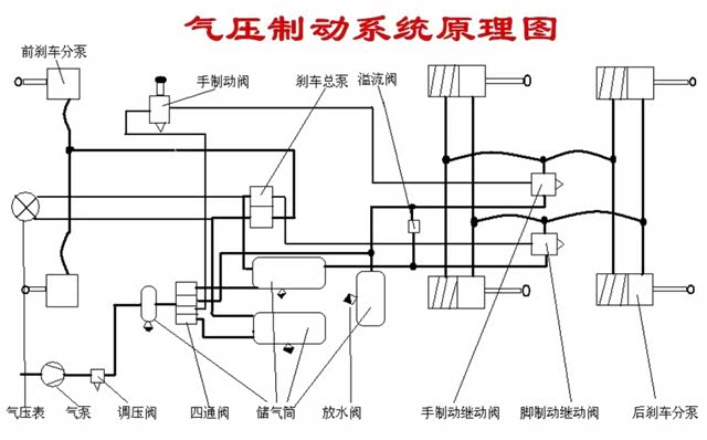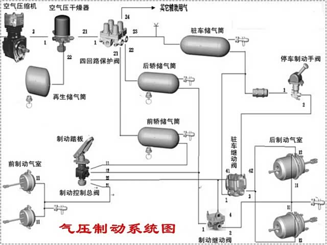 首先我们来看一下常见的气压制动系统的工作原理图。气压制动系统是利用压缩空气作为动力源的动力制动系统,常用于卡车和大型卡车上,制动力比液压制动系统更大,但是系统结构复杂,元件众多。它工作原理其实很简单,由气泵制取压缩空气,并储存在储气筒中,当汽车需要制动时,由驾驶员操纵刹车踏板,打开刹车总泵的控制阀门,让储气筒中的压缩空气进入刹车分泵,推动刹车分泵向外张开,进而推动车轮制动器动作,产生制动力让汽车减速直至停车。现在的汽车基本都是前后轮独立控制的双管路制动,当某一套管路失去制动作用时,另一套管路仍然可以继续正常工作,避免汽车彻底失去制动力。
