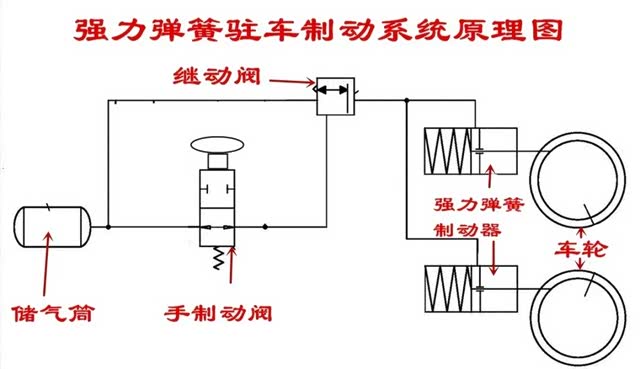整套系统的工作过程如下:发动汽车,制动系统气压达到0.65MPa以上,松开手制动阀,压缩空气进入继动阀活塞上方,使活塞下行,打开继动阀;等待在继动阀进气口的压缩空气瞬间通过继动阀,从出气口进入强力弹簧驻车制动器的驻车制动气室,压缩强力弹簧至极限位置,从而使驻车制动解除;当停车时,驾驶员拉上手制动阀,继动阀中活塞上方的压缩空气从手制动阀中排出,然后继动阀在弹簧作用下关闭,同时将排气口打开,驻车制动气室中的压缩空气从继动阀排气口排出,强力弹簧弹出,推动车轮制动器制动。