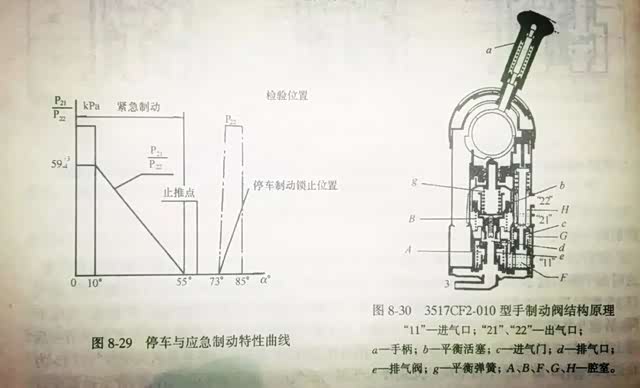 手制动阀同时也是汽车上的应急制动阀。当汽车的行车制动系统失去作用时,操作手制动阀不仅可以让汽车停下来,还可以随时控制汽车的制动力大小。手制动阀具有随动作用,不同的手柄转角,对应不同的继动阀开度,从而控制车轮制动力的大小。当它完全关闭时,产生最大的驻车制动力。一般来说,汽车的最大驻车制动力要大于最大行车制动力的60%。所以,卡车的驻车制动是非常强大的,一般要求在满载的情况下,可以可靠的停放在30%的坡度上。