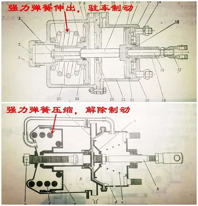 强力弹簧驻车制动器是该系统中最核心、也是技术最复杂的零部件,如果说手制动阀和继动阀是控制元件的话,那么它就是执行元件。它是一个同时具有行车制动与驻车制动双重作用的综合体,行车制动气室与驻车制动气室之间用隔板隔开,分别由行车制动控制管路和驻车制动控制管路控制,二者独立运行,但是共用一套执行机构。