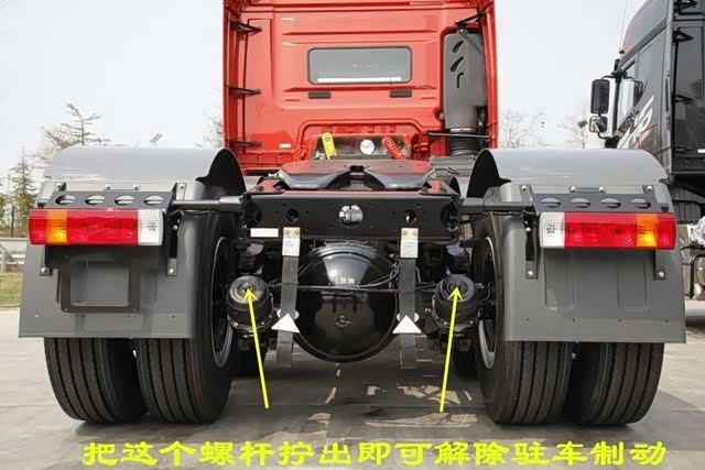 那么如果出现了汽车发动机故障,或者由于某种原因导致制动系统没有压力,此时强力弹簧永远处于伸张位置,车轮保持最大的制动力。此时若需要开动或者拖车,该怎么解除驻车制动呢?在这种情况下,我们只要把驻车制动气室后面的一个螺杆拧出来就可以了。这个螺杆的前端与驻车制动活塞相连,当它向外旋出时,就可以压缩强力弹簧,进而解除强力弹簧对车轮制动器的推力,制动因此解除。需要注意的是,在旋出这个螺杆之前,必须把车轮掩好,防止驻车制动解除的瞬间汽车移动造成人员伤害。
