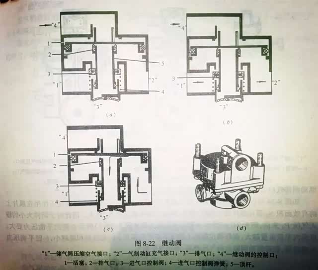 继动阀的本质是一个放大阀,它只起到一个用小气量控制大气量的作用,但是不会改变汽车的制动性能。此外,由于卡车的轴距比较长,刹车总泵与刹车分泵之间的距离较远,后桥制动分泵的气容量又比较大,如果直接用刹车总泵控制刹车分泵,那么汽车的制动反应时间就会过长,导致制动距离过大。为此在距离后制动分泵最近的地方设置一个继动阀,由储气筒通过一根较粗的气管直接供气,由刹车总泵上一根较细的气管来控制继动阀的开启与关闭,这样就可以极大的缩短制动反应时间,起到了一个“快充、快放”的作用。它的工作原理如下图所示,接口上的数字“1”表示进气口,“2”表示出气口,“3”表示排气口,“4”表示控制气口。
