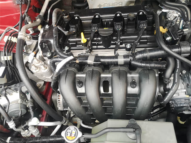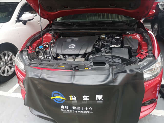 接着我们进行发动机舱部分的检测,机舱的卖相不错,明显做过清洁处理。介绍下本车的动力配置,车辆带着的是2.0L自然吸气发动机,最大功率114Kw,最大马力155Ps,最大扭矩200N.m,搭配马自达创驰蓝天技术,只需要喝92号汽油。