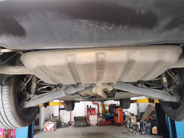 顺路开到了上架的地方检查底盘,把车子举高高,底盘看上去干爽规整,没有大面积的托底剐蹭痕迹。