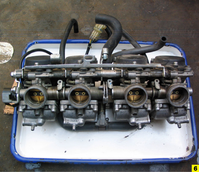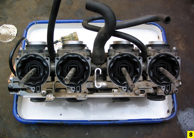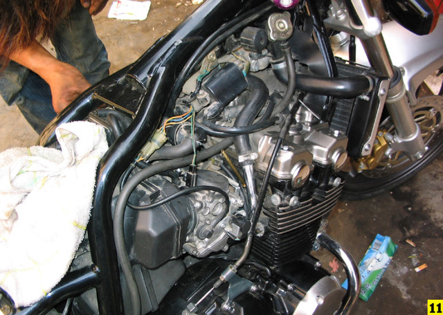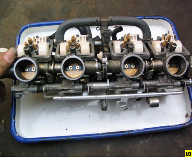 发现一缸和四缸的节流阀与二缸和三缸的有很轻微的偏差,但这个偏差实在太小,只是自我感觉有偏差,但不确定。对整个化油器进行清洗调整后把化油器重新装到车上,如图11所示。