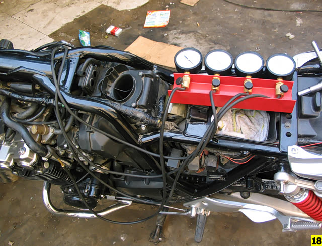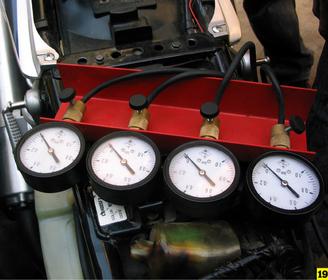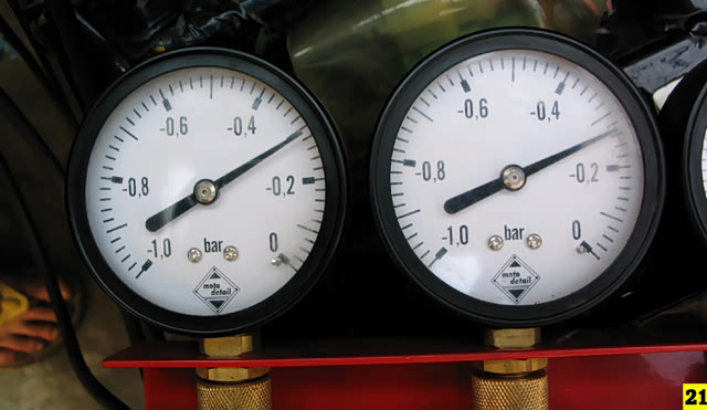 调整化油器上的三个平衡螺丝,使四个平衡表上显示的数值一致。此时怠速非常稳定,不管是启动、怠速、空加速,发动机工作状态都非常好。拆下真空表与连接铜管,装上进气道平衡调整螺丝和油箱。