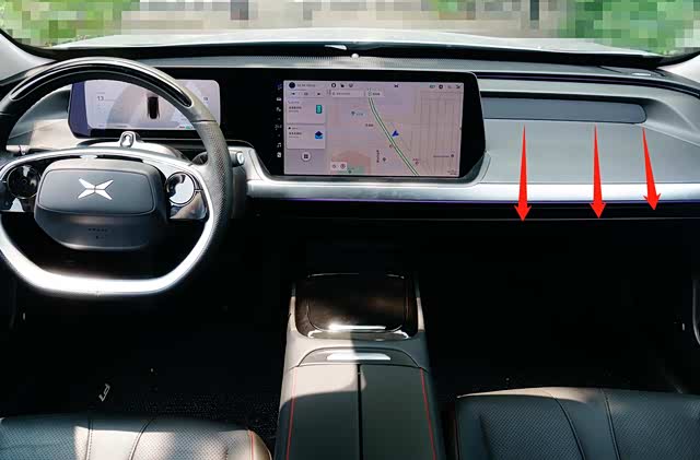 P7的内装全面去除了物理按键,只有方向盘保留了2组多功能开关。红色箭头所指的仪表台营造出宽厚感觉,驾驶员用和中置显示屏一体化横置便于驾驶员快速读取行车数据和导航系统的操作。
