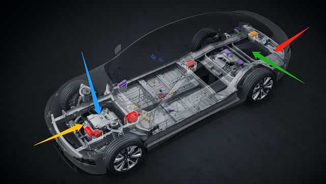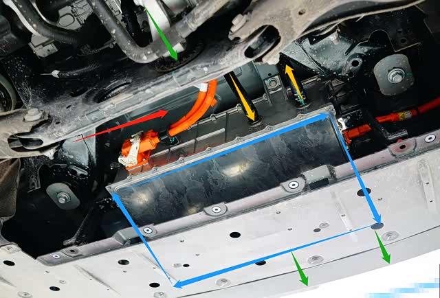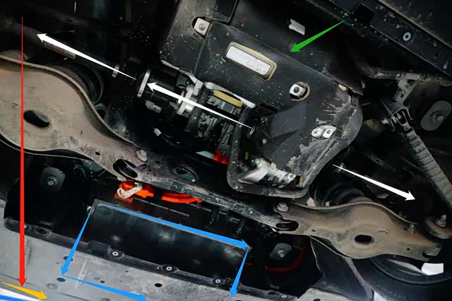 蓝色箭头:位于车身焊接后地板下端布置的“3合1”高压用电系统总成