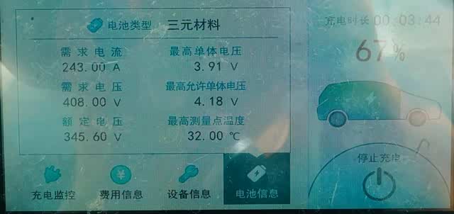 在符合国家电网60千瓦充电进行快充测试,动力电池SOC值67%开始进行快充,电芯温度从32摄氏度起始。