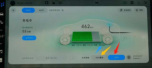 在P7的车载端显示充至满电需要55分钟、充电电流为115.1安、电压376.1伏、充电功率为43.3千瓦。笔者注意到,P7的工程师们为充电设定了1个由驾驶员可调的SOC值选项。驾驶员可以自由选择日常充电至SOC值90%或100%,且系统自默认为90%,如果强制选择100%,系统将提示“本次充电后将回复至90%”。