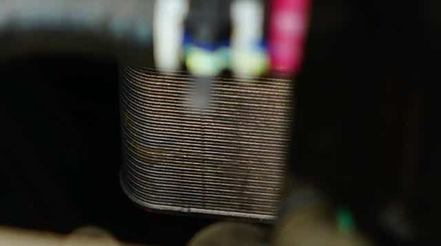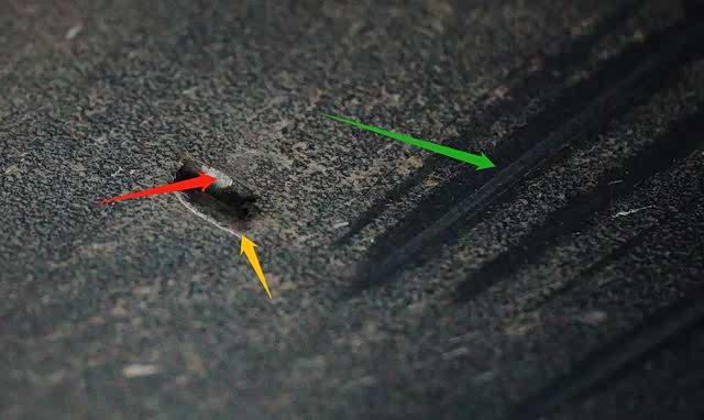 为了应对行驶过程中异物对电池底部铝合金壳体的冲击,在其表面喷涂了一层有一定厚度的软性涂层。不过,这一组用于保护动力电池底部的软性涂层已经出现了大面积的划痕和穿透伤(黄色箭头所指)。