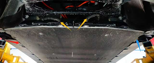 红色箭头:裸露的动力电池总成铝合金下壳体