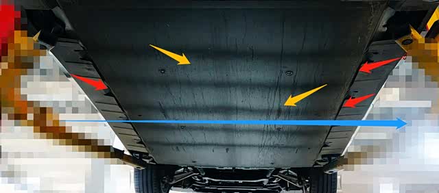 红色箭头:动力电池与车身焊接侧边梁之间加装的塑料侧护板