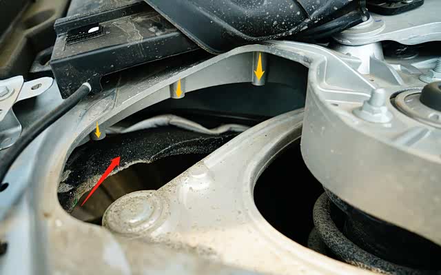 拆除塑料防尘罩后,可以看到减震器车身焊接固定组件内侧3组加强筋(红色箭头所指),和纤维材质的轮内衬(红色箭头所指)。显然,P7的轿跑化与特斯拉一样的前置行李舱的“车设”,所带来传播方面的优势背后,就是要在为了挤占的空间而将“3合1”高压用电系统后置;较低的前部行李舱要向容纳足够的上A型摆臂预设行程空间,就要将减震器车身焊接固定开一个“天窗”。不过左右各一组“天窗”另一个好处是再次减重,可是也会带来减震器车身焊接固定强度降低以至变形的疑虑。