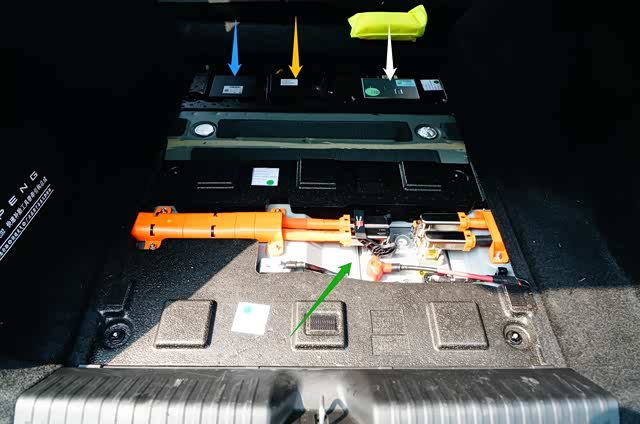 从P7后备箱内拍摄后置“3合1”高压用电系统总成上部高压线缆连接端的细节特写。红色箭头所指的就是“3合1”高压用电系统总成,被布置在车身焊接后地板下端,为了方便检修更换,而开了一个“天窗”。