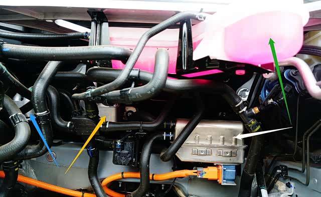 黄色箭头:“3合1”电驱动总成、“3合1”高压用电系统总成、动力电池热管理系统共用1组循环管路补液壶