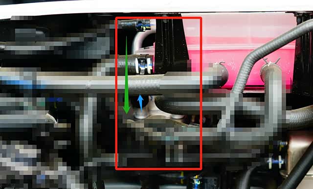 上图为固定在P7前围板的电驱动高温散热循环管路,动力电池热管理系统循环管路及附属分系统状态特写。
