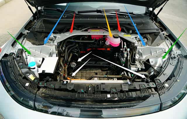 白色箭头:位于前置行李舱下端的三组不同功率电子水泵