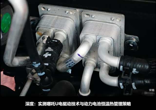 上图为为哪吒U电动汽车搭载的水冷板控制模块技术状态特写。在水冷板控制模块,有1组来自电动空调压缩机通过制冷剂输入“冷量”的循环,有1来自动力电池内诸多电芯通过冷却液输出“热量”的循环。“冷量”和“热量”在水冷板控制模块进行交换,已达到对电芯散热的目的。哪吒U搭载的水冷板控制模块,也采用的是“2合1”结构,2组水冷板通过管路连接,具备2种“冷热”交换功率的设定能力。