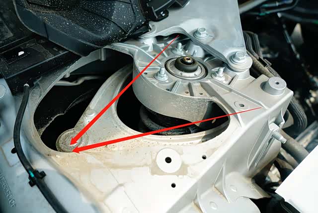 将橡胶防尘罩拆除后,通过减震器车身焊接固定组件上端镂空部分,可以看到了材质A型上摆臂(红色箭头所指)。由于P7采用轿跑形式的“车设”,在保证车内驾驶员足够空间、悬置在车身焊接底部的动力电池足够尺寸容纳足够电量、在保证必要的整车离地间隙,对车身进行轻量化同时,还要考虑诸如上A行摆臂最大摆幅是否会“顶”出减震器车身焊接固定组件。