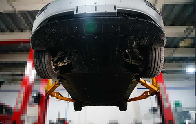 将P7举起可见,前转向驱动桥和后置驱动桥的底部完整的覆盖塑料护板,中置动力电池总成底部则粘贴一层软材质涂层,起到缓冲异物冲击的作用。