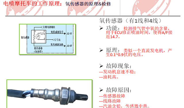 三是氧传感器陶瓷碎裂,加热电阻丝烧断,内部线路断开等,不再详述。详情可参阅【指尖摩托】提供的技术资料。